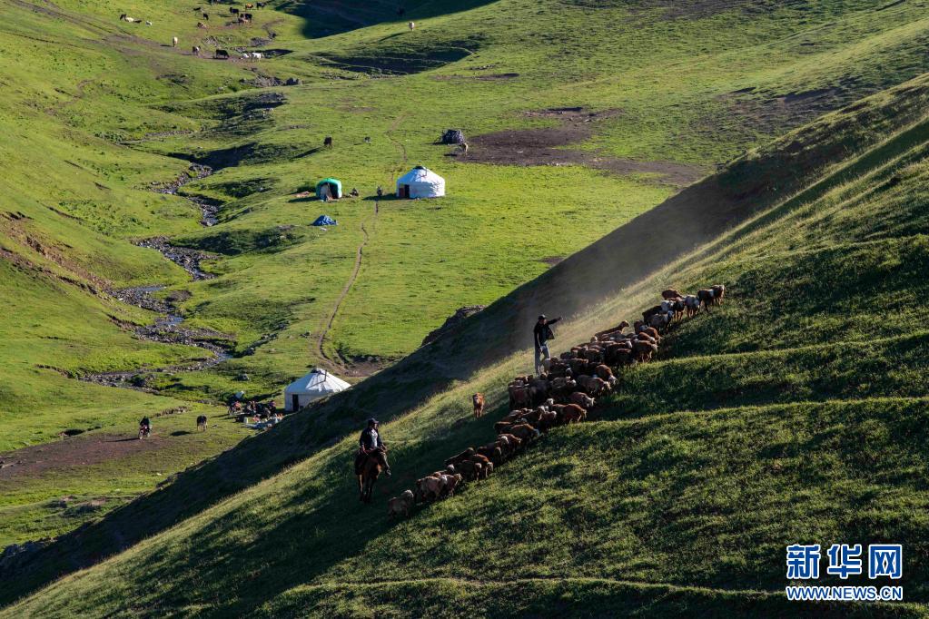 眼下,巴爾魯克山區(qū)的夏牧場迎來放牧黃金季。群山起伏,峰巒翠綠,氈房、牛羊等牲畜分散點綴其間,自駕游客時而穿梭往來,共同譜寫一曲高山夏季牧歌。