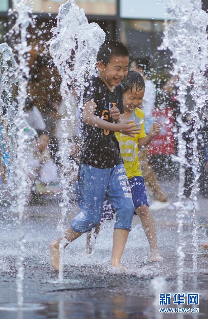 6月20日,孩子們在北京華熙LIVE·五棵松商業街區一處噴泉戲水。