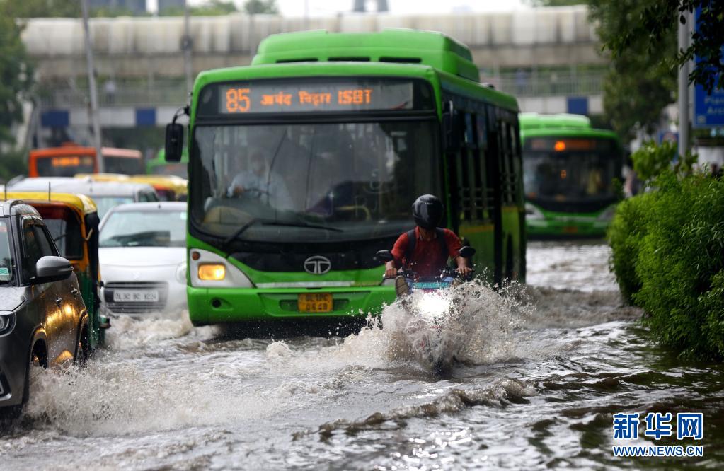 7月14日,車輛在印度新德里積水的街道上行進。