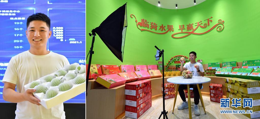 拼版照片:左圖為董晨旭展示山西省臨猗縣產(chǎn)的梨;右圖為董晨旭通過網(wǎng)絡(luò)直播介紹當(dāng)?shù)禺a(chǎn)的桃(7月13日攝)。今年22歲的董晨旭是臨猗縣北景鄉(xiāng)張村人,他年紀(jì)不大,卻有著豐富的開店經(jīng)驗。為了幫助鄉(xiāng)親們在網(wǎng)上銷售水果,他于2020年3月開始在電商平臺創(chuàng)業(yè),店鋪在旺季達(dá)到一天一萬余箱的銷售量,讓他對農(nóng)村電商發(fā)展充滿了信心。