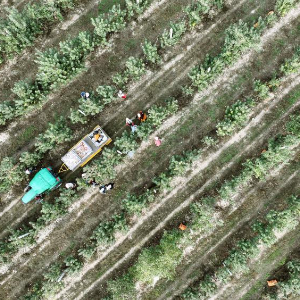 农户在中卫市沙坡头区“旱苹果”种植基地采摘苹果(10月25日摄,无人机照片)。