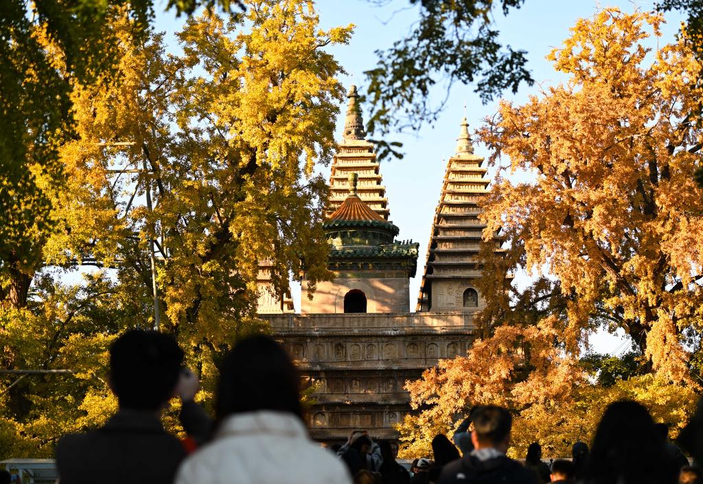 秋冬之交的北京石刻艺术博物馆(也称五塔寺)内,银杏等大面积泛黄,石刻文物掩映在绚烂的色彩中,吸引不少游客前往观赏。