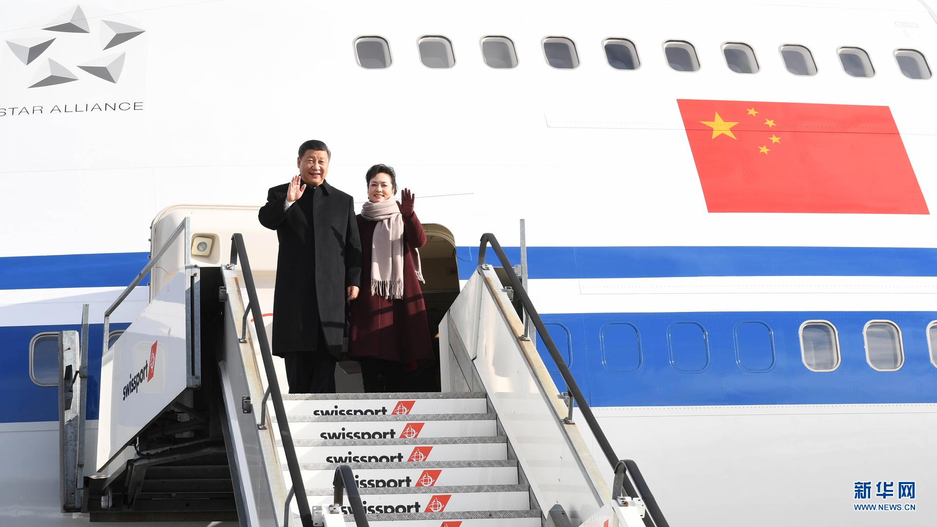 1月15日,國家主席習近平乘專機抵達蘇黎世,開始對瑞士聯邦進行國事訪問。 這是習近平和夫人彭麗媛步出艙門。 新華社記者丁林攝2017-01-16