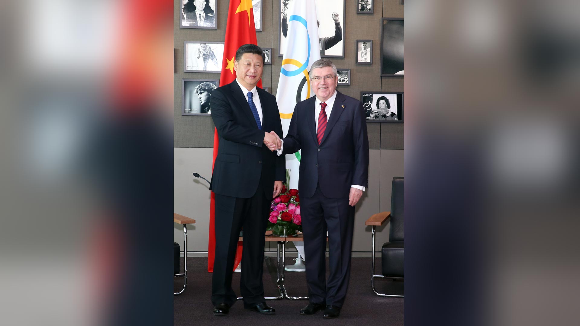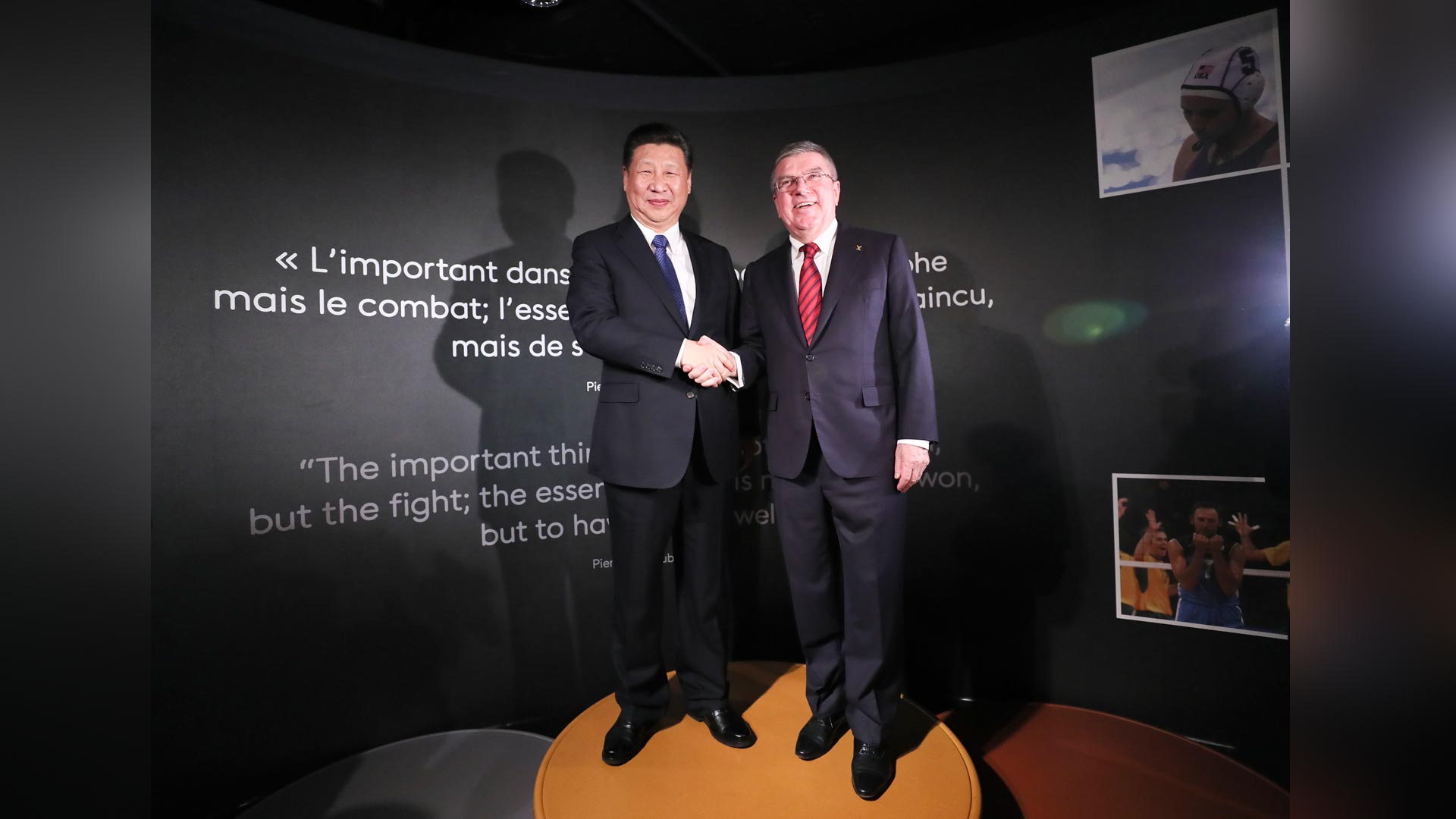 1月18日,國家主席習近平在瑞士洛桑國際奧林匹克博物館會見國際奧林匹克委員會主席巴赫。這是習近平和巴赫在奧運冠軍領獎臺上合影。新華社記者 蘭紅光 攝2017-01-19