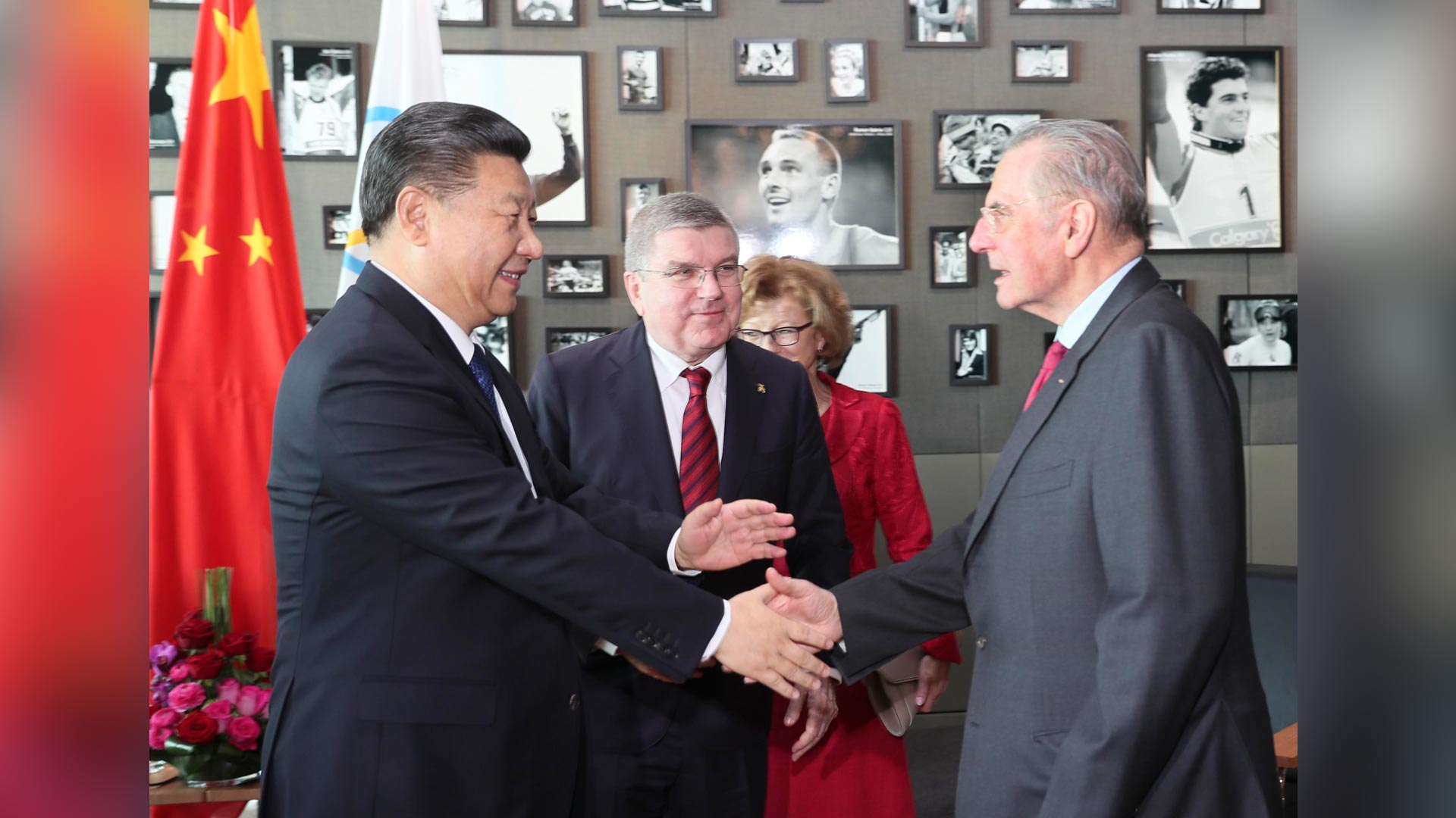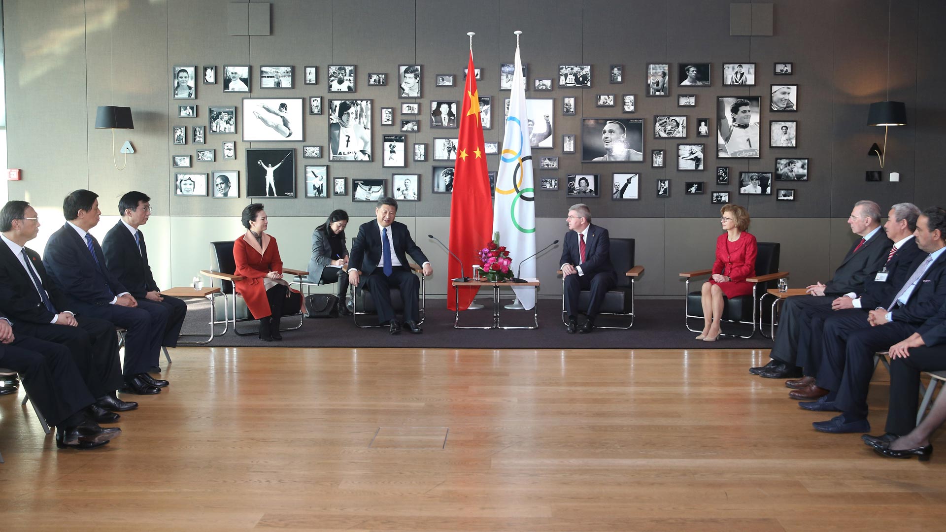 1月18日,國家主席習近平在瑞士洛桑國際奧林匹克博物館會見國際奧林匹克委員會主席巴赫。這是習近平和夫人彭麗媛與巴赫夫婦及部分國際奧委會中國委員在國際奧委會會旗前合影。新華社記者 蘭紅光 攝2017-01-19