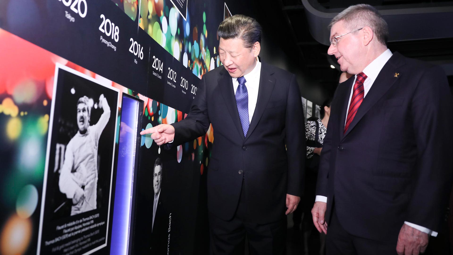 1月18日,國家主席習近平在瑞士洛桑國際奧林匹克博物館會見國際奧林匹克委員會主席巴赫。這是習近平在巴赫陪同下,參觀巴赫作為擊劍運動員參加奧運會的照片。新華社記者 蘭紅光 攝2017-01-19