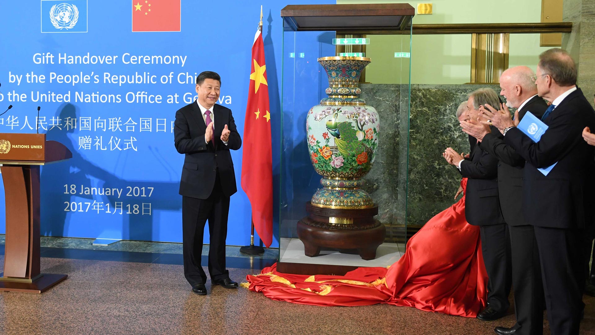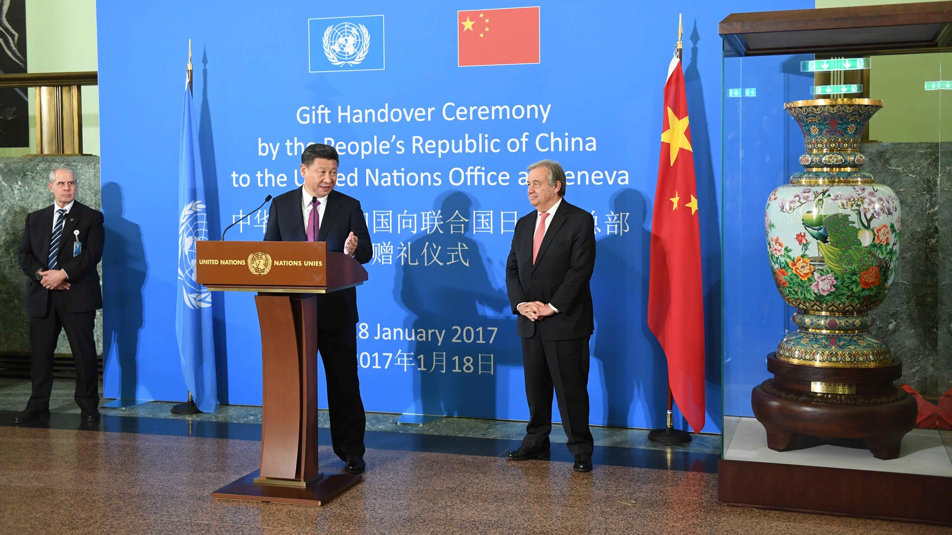 1月18日,國家主席習近平在瑞士日內瓦萬國宮出席“共商共筑人類命運共同體”高級別會議,并發表題為《共同構建人類命運共同體》的主旨演講。這是會議結束后,習近平出席中國向聯合國日內瓦總部贈禮儀式。新華社記者 張鐸 攝2017-01-19
