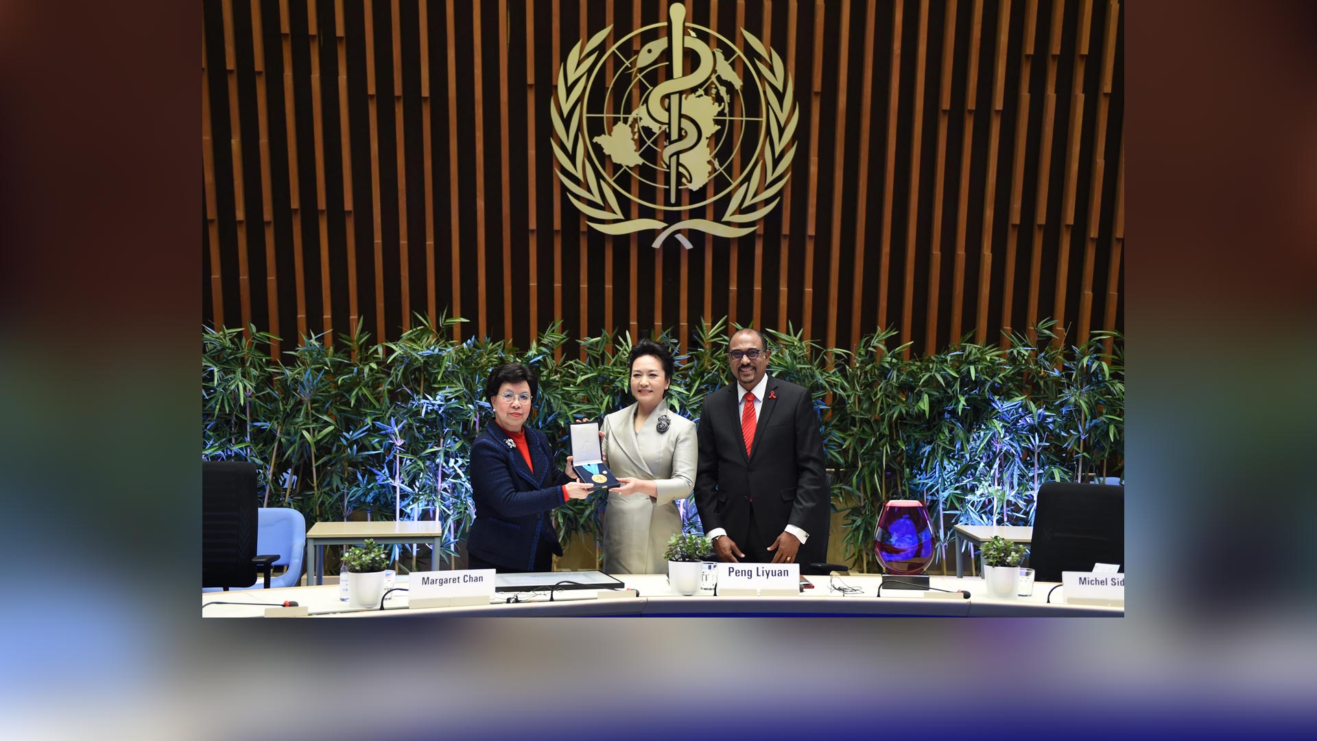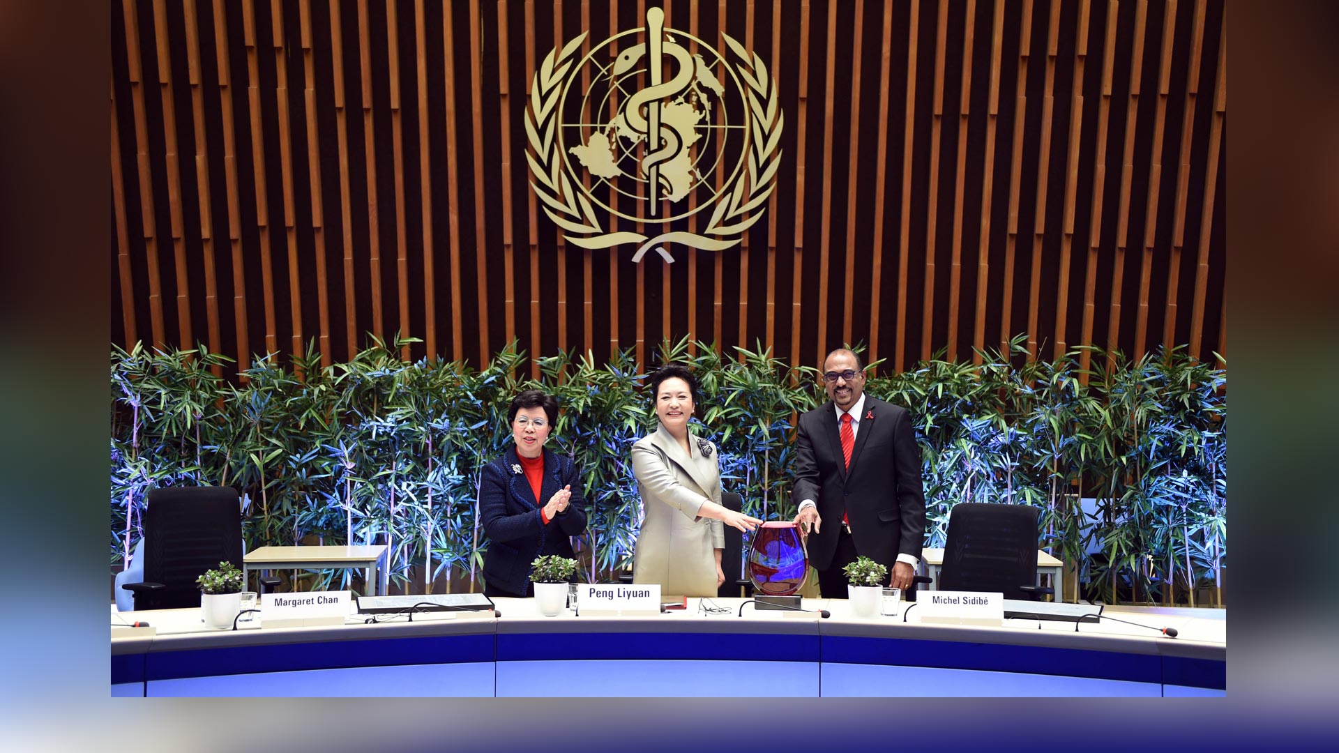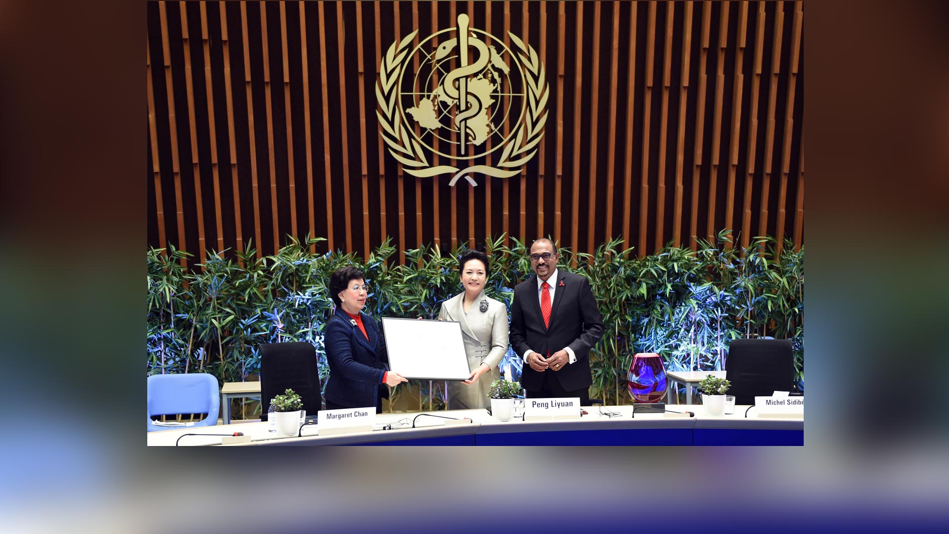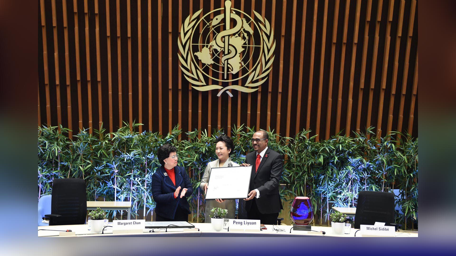 1月18日,國家主席習近平夫人、世界衛生組織結核病和艾滋病防治親善大使彭麗媛應世界衛生組織總干事陳馮富珍和聯合國艾滋病規劃署執行主任西迪貝邀請,在瑞士日內瓦出席為她舉行的親善大使任期續延暨頒獎儀式。這是聯合國艾滋病規劃署執行主任西迪貝向彭麗媛頒發艾滋病防治“杰出成就獎”獎杯。新華社記者謝環馳攝2017-01-19