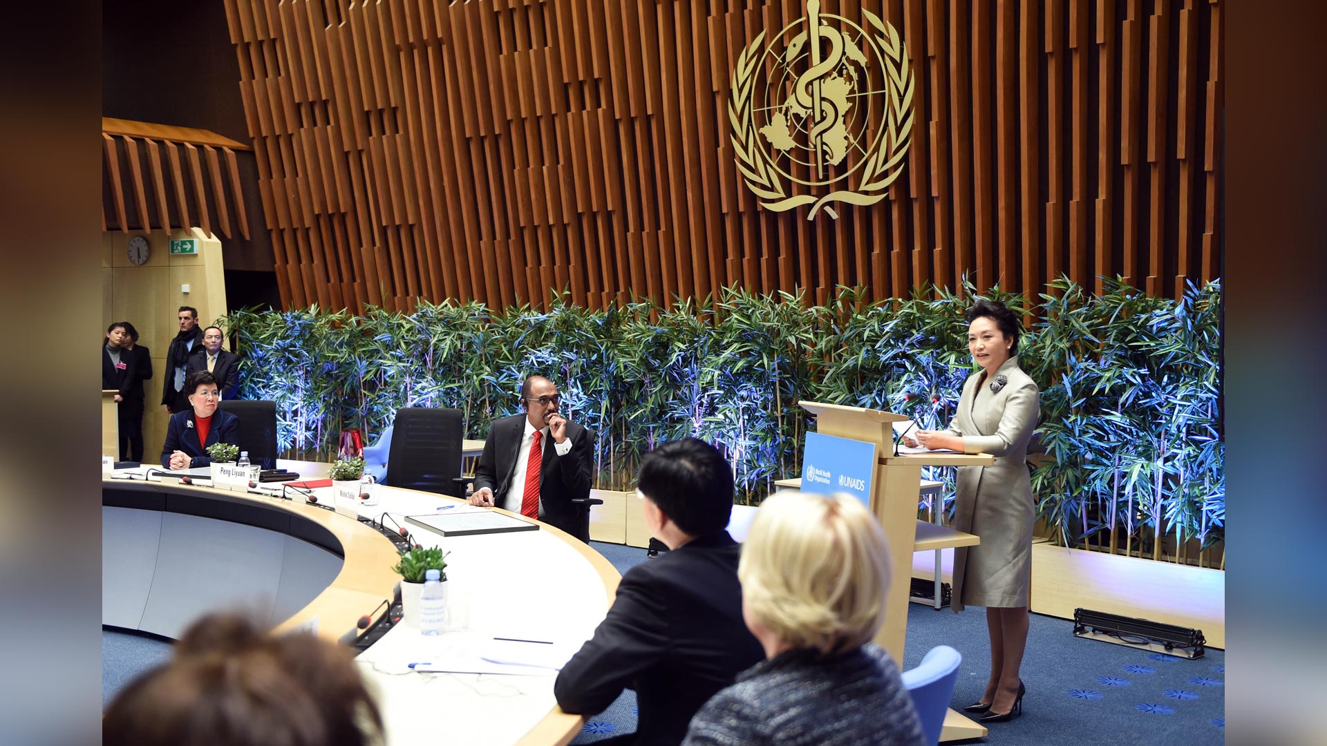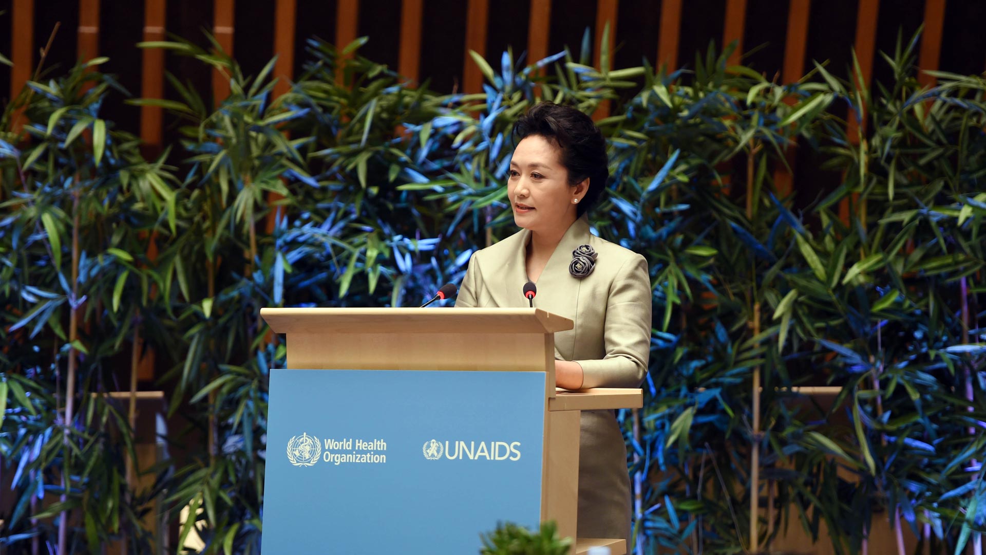 1月18日,國家主席習近平夫人、世界衛生組織結核病和艾滋病防治親善大使彭麗媛應世界衛生組織總干事陳馮富珍和聯合國艾滋病規劃署執行主任西迪貝邀請,在瑞士日內瓦出席為她舉行的親善大使任期續延暨頒獎儀式。這是彭麗媛在儀式上致辭。新華社記者謝環馳攝2017-01-19