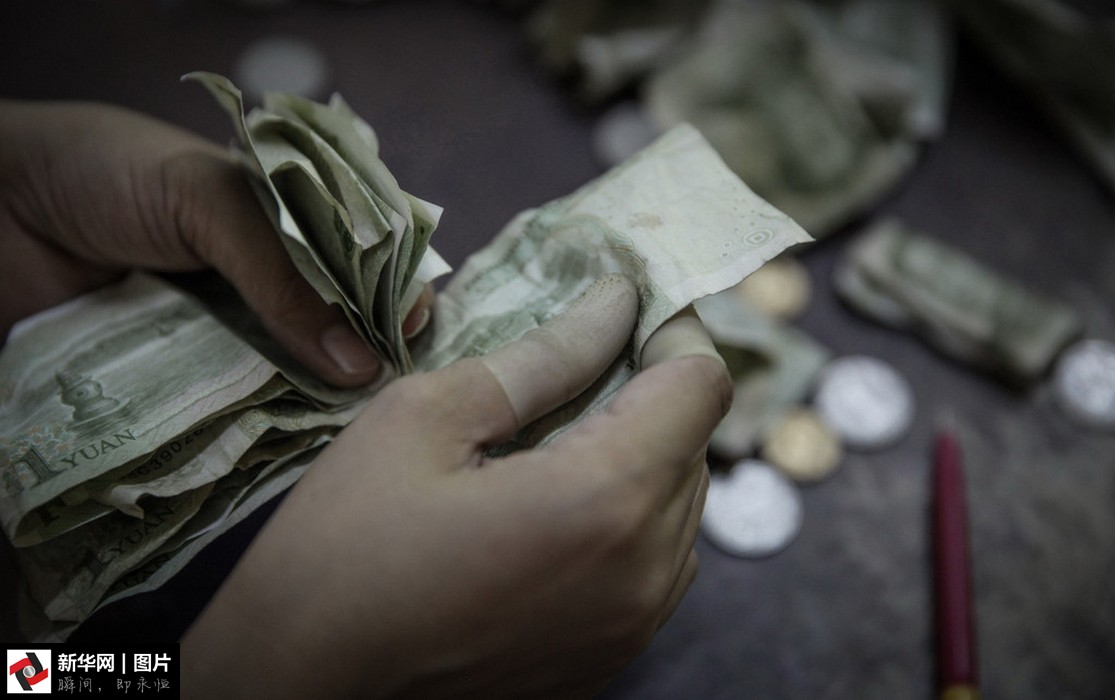 點鈔員從成堆的投幣箱內(nèi)清理出零鈔準(zhǔn)備清點。
