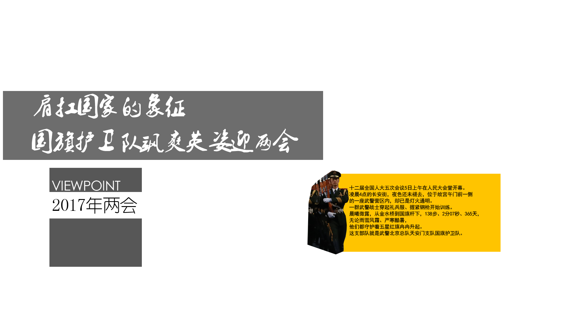 2017年3月5日,第十二屆全國(guó)人民代表大會(huì)第五次會(huì)議在人民大會(huì)堂開(kāi)幕。凌晨4點(diǎn)的長(zhǎng)安街,夜色還未褪去,位于故宮午門(mén)前一側(cè)的一座武警營(yíng)區(qū)內(nèi),卻已是燈火通明。一群武警戰(zhàn)士穿起禮兵服、握緊鋼槍開(kāi)始訓(xùn)練。晨曦微露,從金水橋到國(guó)旗桿下,138步、2分07秒、365天,無(wú)論雨雪風(fēng)霜、嚴(yán)寒酷暑,他們都守護(hù)著五星紅旗冉冉升起。這支部隊(duì)就是武警北京總隊(duì)天安門(mén)支隊(duì)國(guó)旗護(hù)衛(wèi)隊(duì)。