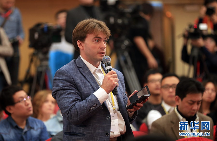 ??? 10月19日,十九大新聞中心舉行記者會,邀請中紀委、中組部負責人介紹黨的建設和全面從嚴治黨相關情況。圖為俄通·塔斯社記者提問。新華網(wǎng) 郝廣鵬攝