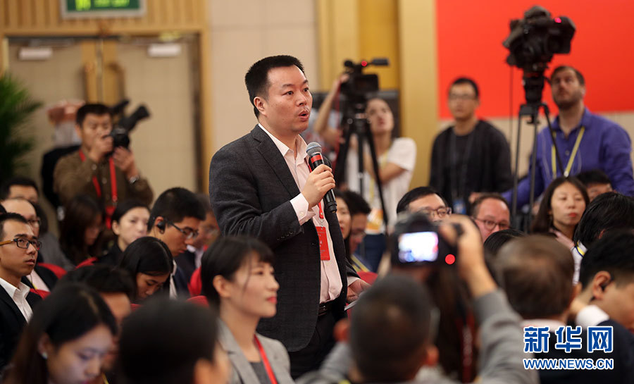 10月21日,十九大新聞中心舉辦記者招待會,邀請國家發(fā)展改革委黨組書記、主任何立峰,副主任張勇,副主任寧吉喆介紹以新發(fā)展理念為引領(lǐng),推進(jìn)中國經(jīng)濟(jì)平穩(wěn)健康可持續(xù)發(fā)展有關(guān)情況,并回答記者提問。圖為人民鐵道報記者提問。新華網(wǎng) 郝廣鵬攝