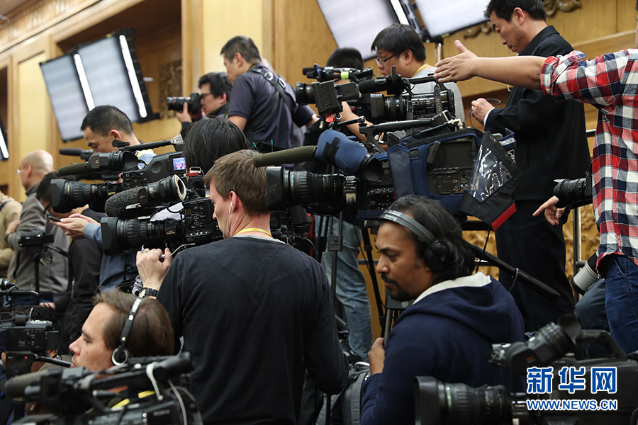 中外記者在見面會現(xiàn)場進(jìn)行準(zhǔn)備工作