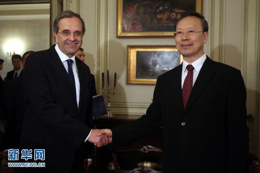 ??? 11月18日,希臘總理薩馬拉斯(左)在首都雅典會見到訪的中共中央書記處書記、全國政協(xié)副主席杜青林。 新華社發(fā)(馬里奧斯·羅洛斯攝)