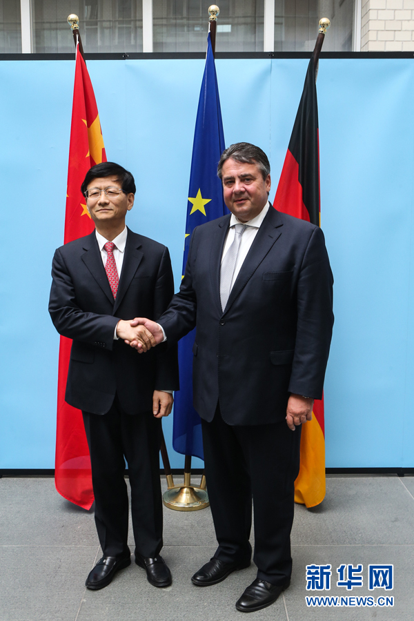 ?? ?6月29日,習近平主席特使、中共中央政治局委員、中央政法委書記孟建柱(左)在德國首都柏林會見德國副總理兼經濟和能源部長加布里爾。新華社記者張帆攝
