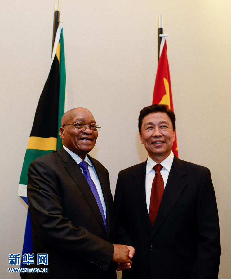 11月22日,南非共和國(guó)總統(tǒng)、非洲人國(guó)民大會(huì)主席雅各布·祖馬(左)在開普敦會(huì)見應(yīng)邀訪問的中國(guó)國(guó)家副主席李源潮。 新華社記者翟健嵐攝