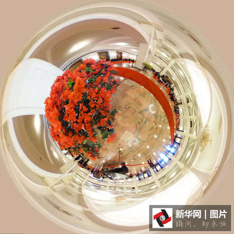 ??? 兩會期間,人民大會堂里溫暖如春,杜鵑花、迎春花等春花競相開放,記者用360度球形全景的特殊視角展現人民大會堂里春花開放的美景。圖片來源:視覺中國