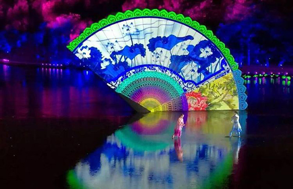 2016年9月4日晚,一場(chǎng)名為“最憶是杭州”的文藝演出在杭州西子湖畔進(jìn)行室外表演。隨著《春江花月夜》《采茶舞曲》帶著中國(guó)傳統(tǒng)文化的韻律登臺(tái)表演,360度巨型圓扇在水面上完美地映射出來(lái),點(diǎn)燃了文藝晚會(huì)的高潮。