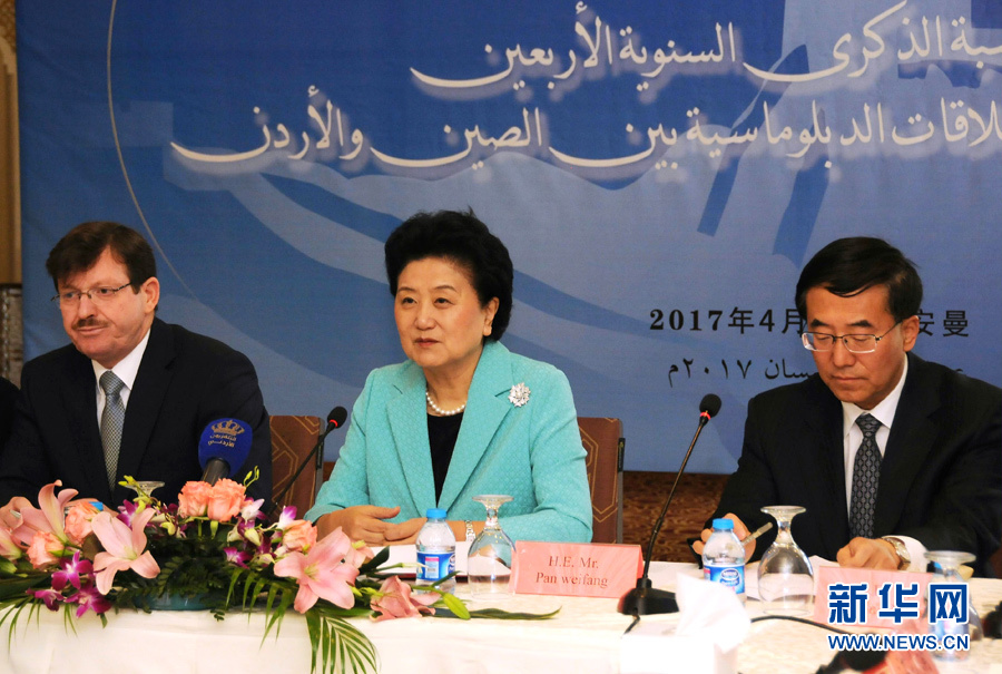 4月20日,正在對約旦進(jìn)行正式訪問的中國國務(wù)院副總理劉延?xùn)|(中)在安曼出席中約建交40周年座談會。 新華社記者林曉蔚攝