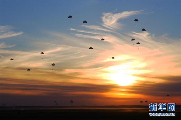 黃繼光生前所在連官兵在朱日和訓練基地參加“礪劍-2013”集群傘降訓練(2013年8月26日攝)。新華社發(fā)(袁文濤 攝)