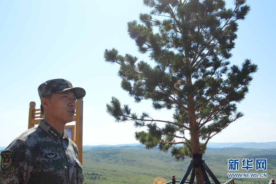 6月24日,三角山哨所,候躍敏排長在樟子松旁介紹“相思樹”的故事。新華網 張敏彥 攝