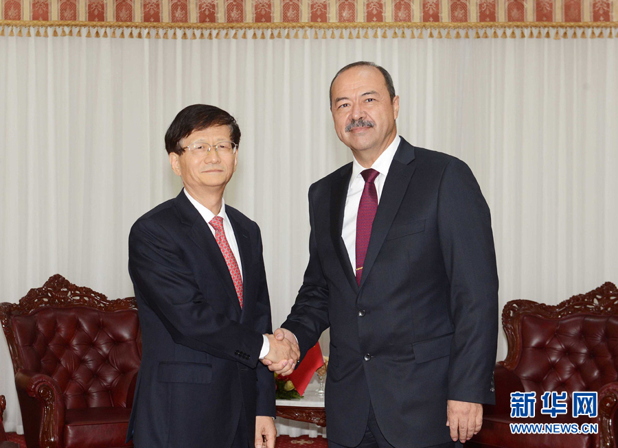 9月9日,中共中央政治局委員、中央政法委書記、中國(guó)和烏茲別克斯坦政府間合作委員會(huì)中方主席孟建柱(左)在塔什干會(huì)見烏總理、中烏政府間合作委員會(huì)烏方主席阿里波夫?! ⌒氯A社記者沙達(dá)提攝