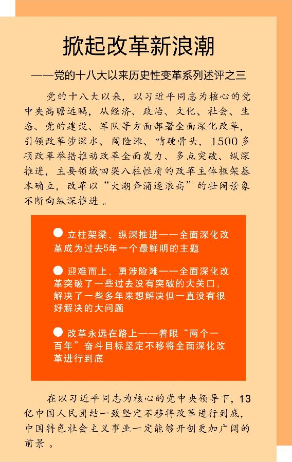 5年來,黨中央以“咬定青山不放松”的精神將各項(xiàng)改革任務(wù)全面推開,使改革大潮席卷神州大地。