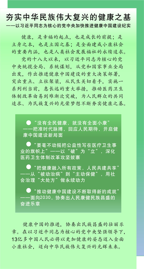 新華社北京10月13日電? 題:夯實中華民族偉大復興的健康之基——以習近平同志為核心的黨中央加快推進健康中國建設紀實