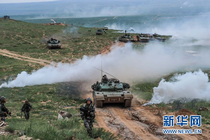 “跨越-2016·朱日和A”演習進入實兵對抗陣地進攻戰,這是紅藍雙方首場對抗中紅軍步兵和坦克協同(2016年7月19日攝)。新華社發(王佳寅 攝)