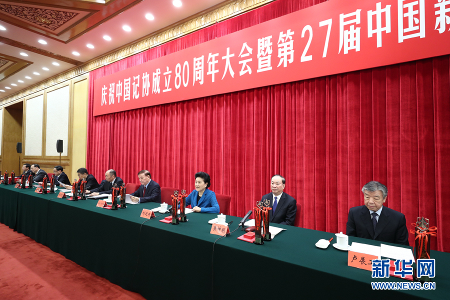11月8日,慶祝中國記協成立80周年大會暨第27屆中國新聞獎頒獎報告會在北京舉行。國務院副總理劉延東在會上宣讀中共中央總書記、國家主席、中央軍委主席習近平的賀信。中共中央政治局委員、中宣部部長黃坤明出席大會并講話。新華社記者鞠鵬攝