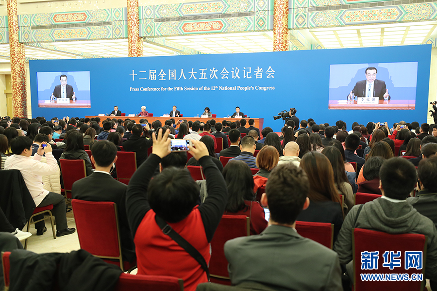 3月15日上午,國務院總理李克強在人民大會堂三樓金色大廳會見采訪十二屆全國人大五次會議的中外記者并回答記者提出的問題。圖為記者會正在進行。新華網/中國政府網 翟子赫 攝?