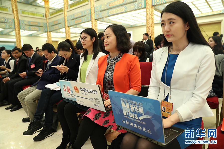3月15日上午,國務(wù)院總理李克強在人民大會堂三樓金色大廳會見采訪十二屆全國人大五次會議的中外記者并回答記者提出的問題。圖為新華網(wǎng)記者在記者會現(xiàn)場。新華網(wǎng)/中國政府網(wǎng) 翟子赫 攝?