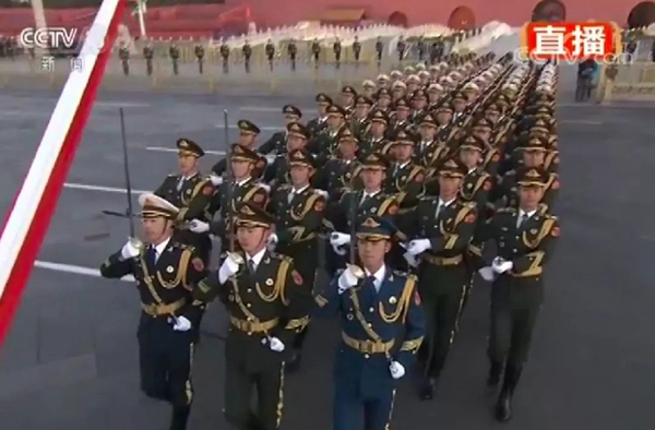 走在國旗手與護旗隊中間的分隊長,此次從一名增加到了三名,他們分別身著陸海空軍禮服,配掛指揮刀,代表解放軍全軍,負責發出升國旗口令。