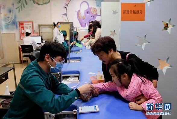 1月3日,在鄭州市兒童醫院輸液大廳,醫務人員在為患兒輸液。當下正值流感高發季節,河南省鄭州市各大醫院的兒科門診就診患者數量增多,其中大部分是呼吸道疾病的孩子。醫務人員提醒市民,預防流感應保持良好的衛生習慣,兒童患流感后要及早就醫,防止重癥流感發生。新華社記者 李安 攝