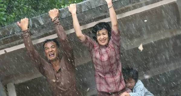 羅先生(任達華飾)羅太太(吳君如飾)用身體撐起頂棚?!稓q月神偷》劇照