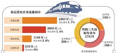 據(jù)交通部門預(yù)測,2018年春運期間進(jìn)出京客流總量預(yù)計達(dá)4263萬人次,同比增長1.7%。其中,鐵路運輸旅客占比近七成,達(dá)2905萬人次,同比增長1.4%。此外,民航運輸旅客1148萬人次,同比增長3.8%;公路省際客運運輸旅客210萬人次,同比減少6%。