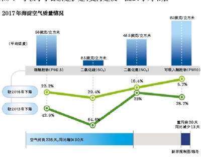 據記者了解,2017年,海淀PM2.5年均濃度為56微克/立方米,空氣質量位居城六區首位;較2016年同比下降22.2%,排名全市第五位;較清潔空氣行動開始的2013年下降42.9%,累計改善幅度位居全市第三位。