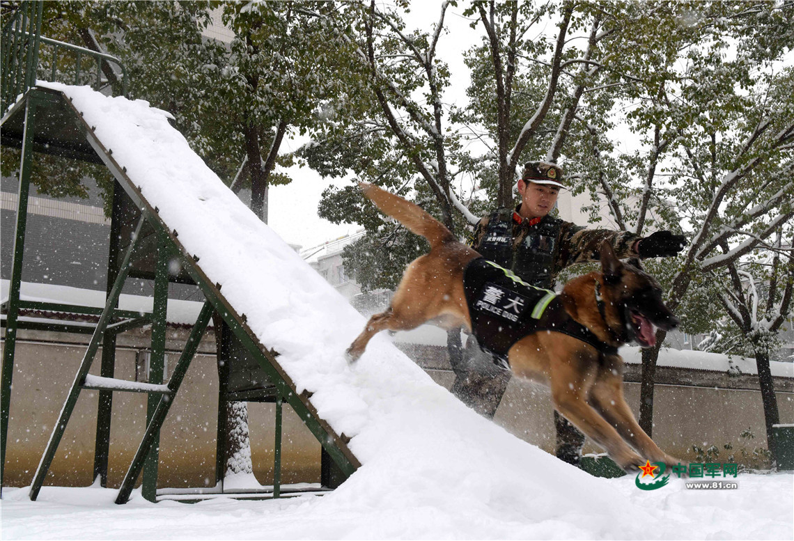 1月27日,武警安徽總隊(duì)機(jī)動(dòng)支隊(duì)警犬班班長(zhǎng)王營(yíng)廣帶領(lǐng)警犬“魯克”通過障礙。