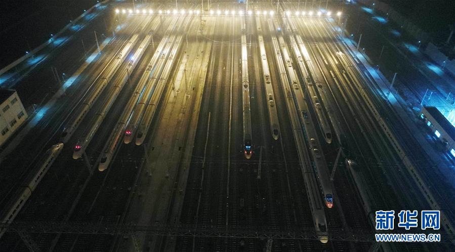 這是1月31日清晨在貴陽北動車運用所拍攝的動車組列車。春運即將開始,貴陽北動車運用所各個系統(tǒng)的工作人員對動車組列車進行全面細致的“體檢”,確保春運期間動車組列車安全運行。新華社發(fā) 吳吉斌 攝