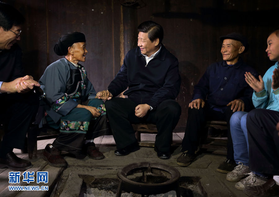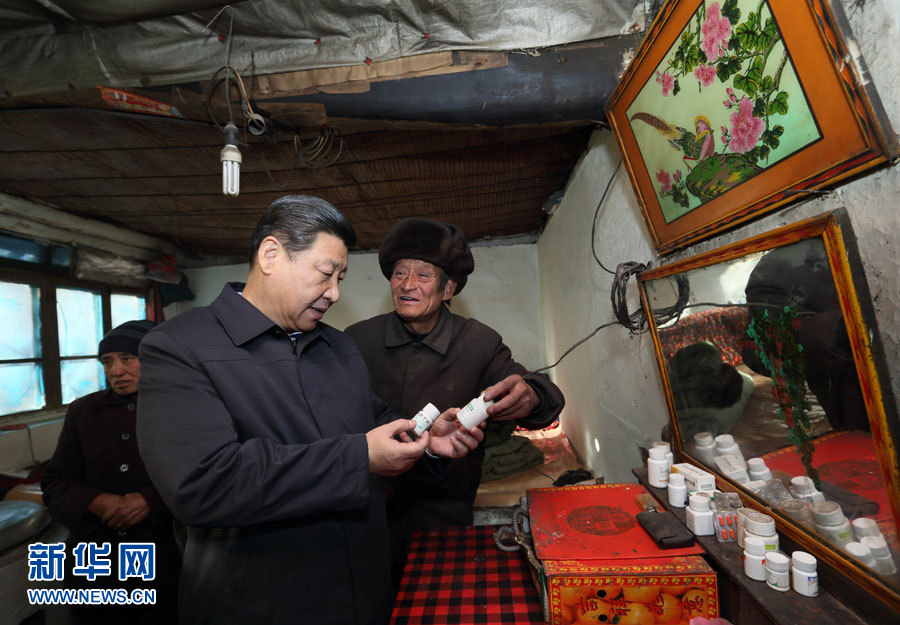 在河北阜平龍泉關鎮駱駝灣村困難戶唐榮斌家,習近平拿起桌上的藥瓶仔細查看,囑咐老人多多保重身體。