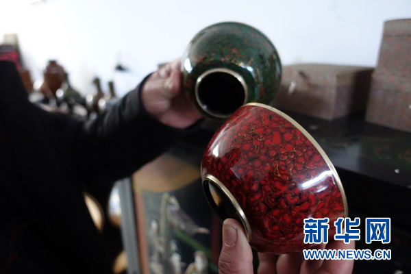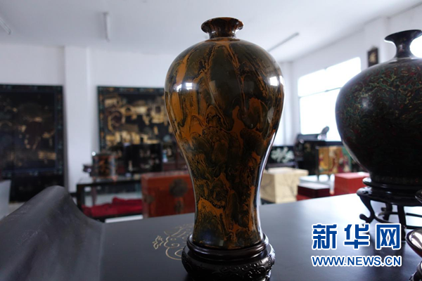 “流淌漆”技藝制作的花瓶。“流淌漆”即通過(guò)變換液態(tài)漆的濕度及流下的角度,使之形成自然的漆面花紋。新華網(wǎng) 卓越 攝