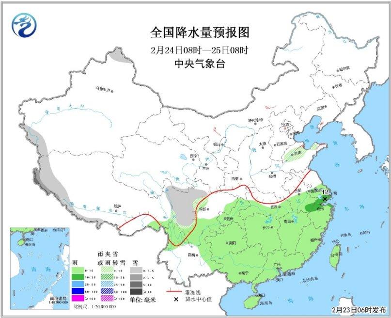24日08時(shí)至25日08時(shí),北疆北部、南疆西部、西藏西南部、川西高原、山東北部等地有小雪或雨夾雪,其中西藏西南部局地有中到大雪;江漢南部、江淮南部、江南、華南、西南地區(qū)東部、云南北部和東部、四川南部、臺(tái)灣等地有小到中雨或陣雨。內(nèi)蒙古中西部、遼東半島、山東半島等地有4~6級(jí)風(fēng)。