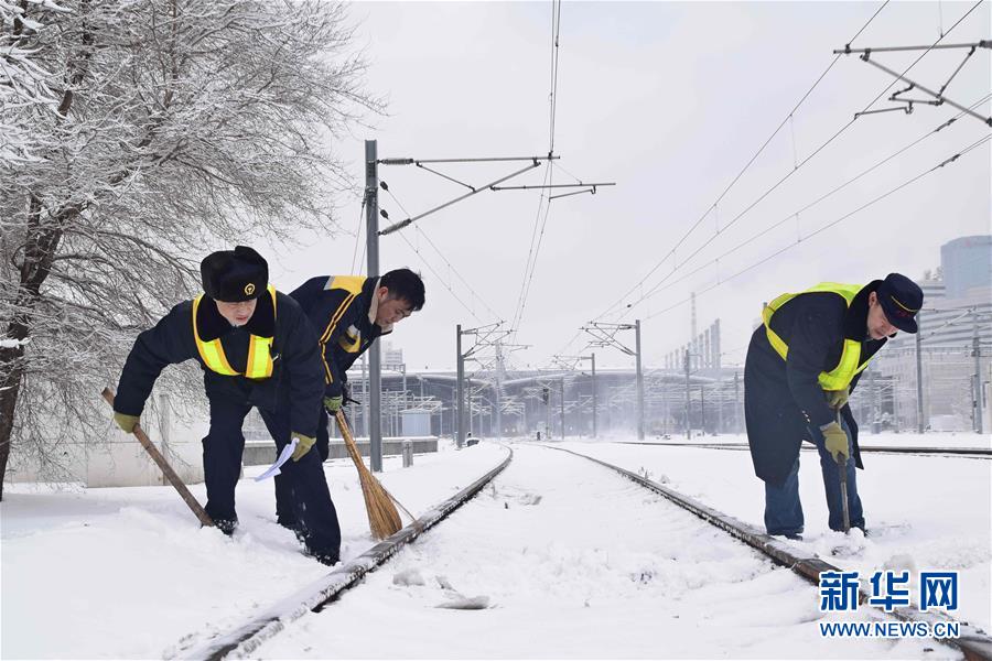 3月15日,沈陽北站的工作人員在清理鐵軌上的積雪。當日,沈陽降落春雪。新華社發(fā)(龍雷攝)