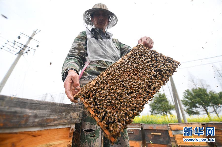 3月14日,來自安徽的蜂農在湖北省潛江市龍灣鎮的油菜花地里放養蜜蜂。早春時節,湖北省潛江市20多萬畝油菜花長勢好、流蜜足,來自全國各地的400多名養蜂專業戶在此收獲“甜蜜”。 新華社發(吳燕軍 攝)