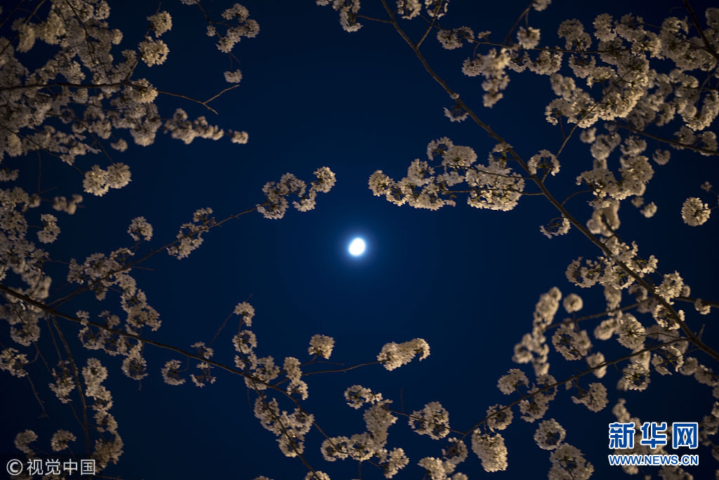 3月25日,揚州鑒真大道,夜幕下的櫻花,在燈光月色的輝映下別有一番意境。(圖片來源:視覺中國)