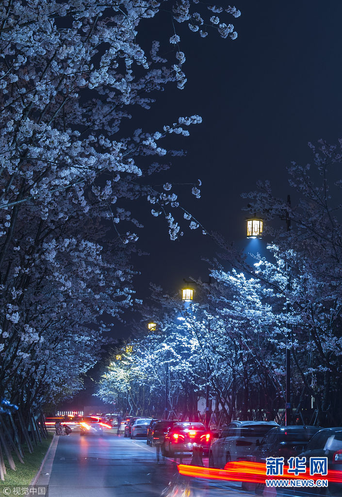3月25日,揚(yáng)州鑒真大道,夜幕下的櫻花,在燈光月色的輝映下別有一番意境。(圖片來源:視覺中國)