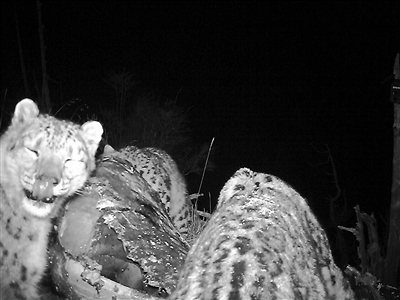 3月11日晚間至12日上午,紅外相機清晰記錄下這樣的畫面:一只雌雪豹帶領兩只小雪豹在分食一只剛剛捕獲的成年牦牛。