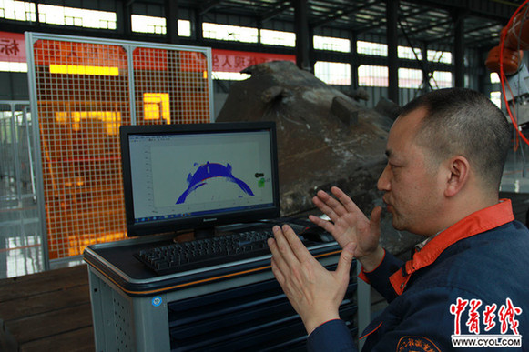 胡明華給記者介紹團隊正在研發的一套自動編程自適應機器人自動打磨系統 李翀 攝