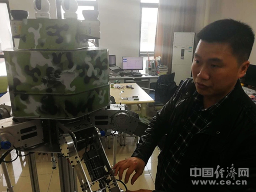 蔣剛介紹“龍騎士”機(jī)器人。經(jīng)濟(jì)日?qǐng)?bào)-中國(guó)經(jīng)濟(jì)網(wǎng)記者 佟明彪/攝